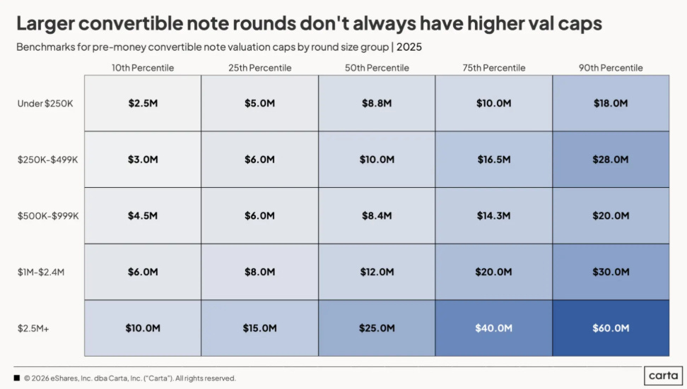 Usando como referência de métricas de valuations de rodadas de SAFE Pre-seed do relatório da Carta, alguns founders estão conseguindo levantar rodadas em montantes e valuation próximos ou acima das medianas globais. Do outro lado, vejo founders com dificuldade de fechar a rodada esperada, ou fechando com valuations próximos ou abaixo do lower quartile.