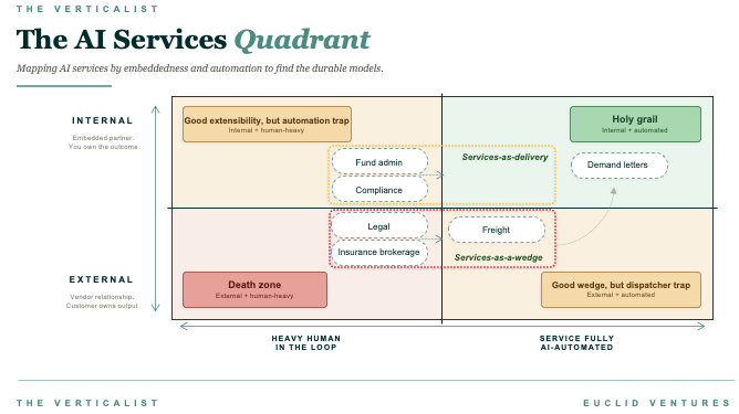 Empresas de serviço que já têm o relacionamento, o framework de responsabilidade e a operação de prestação montada têm vantagem real para empilhar IA em cima e capturar mais do trabalho. A startup de IA que escolhe esse wedge não disputa só contra SaaS tradicionais que estão criando seus agentes, disputa também contra as próprias empresas de serviços, agora armadas com IA.