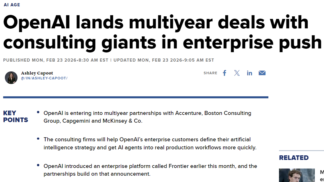 Vale dizer que transformar oferta de software em oferta de serviço está longe de ser simples. Vender serviço significa estar na frente do cliente como um prestador, com responsabilidade pelo resultado, em uma negociação com componente relacional forte para lidar com exceção, retrabalho, SLA, multa. Empresas prestadoras de serviços de pessoas, por exemplo, tem esse frameworks estabelecidos. É um modelo operacional diferente, que exige músculo de venda, jurídico e atendimento que startup de software raramente tem. E é por isso que parte do budget de trabalho vai ser capturada pelas próprias firmas de serviço incumbentes, agora armadas com tecnologia muito melhor. O software pode servir como suporte a esses humanos dessas firmas de serviços que estão executando os projetos e trabalhos. Não por acaso, a OpenAI vem contratando grandes consultorias como canal para penetrar o Codex/Frontier em grandes empresas.