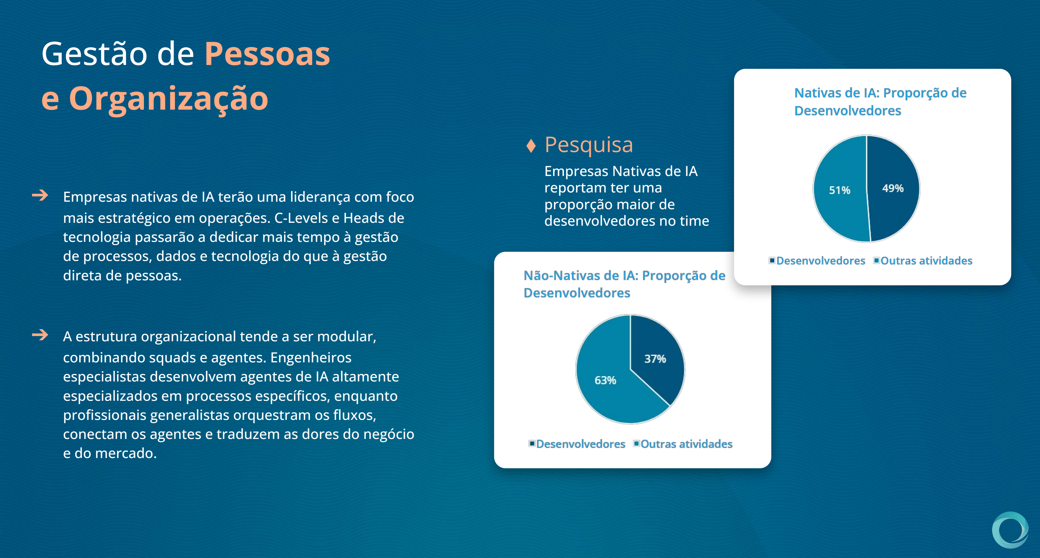 Um dado curioso: se, por um lado, a IA empodera generalistas e profissionais com conhecimento específico de processos e mercados, permitindo que desenvolvam produtos relevantes sem profundo conhecimento técnico, por outro, as empresas nativas de IA possuem proporcionalmente mais engenheiros em suas equipes. Isso, na minha visão, reflete uma mentalidade de empresa de engenheiros, tanto no desejo de criar soluções com profundidade e diferenciação tecnológica quanto na comparação com empresas não nativas de IA, que tendem a manter estruturas mais robustas em áreas como vendas e suporte.