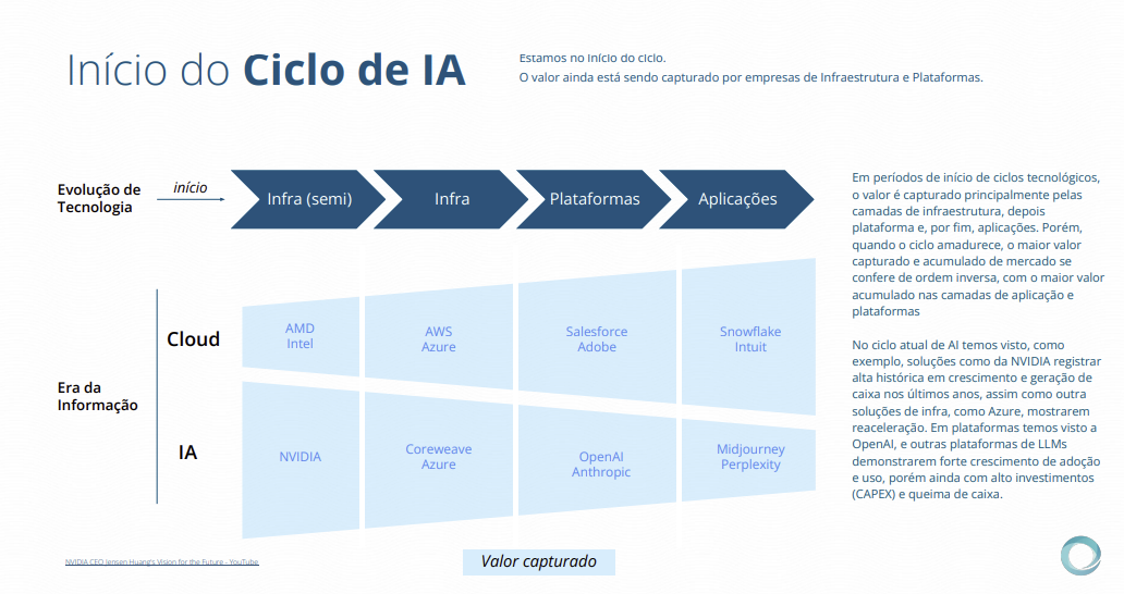 Primeiramente, ainda estamos no início do ciclo da IA. A evolução comercial das tecnologias ocorre em camadas: da infraestrutura, passando por plataformas, até chegar à aplicação. Atualmente, apenas a NVIDIA e a OpenAI demonstram captura de valor ou construção de barreiras que perpetuem a sua criação e captura de valor.