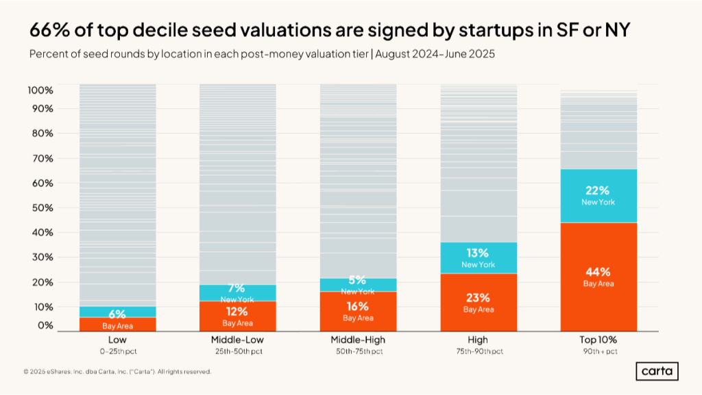 Esse gráfico da Carta ajuda a orientar como olhar para os próprios gráficos da Carta. Ele mostra que 2/3 dos investimentos com top 10% de valuation nos EUA estão sendo feitos em San Francisco e NY. Se olharmos para o meio do gráfico, próximo da mediana de valuation (50th pct), essas duas regiões representam apenas 20%. Como referência, Bay Area e NY contam por cerca de 40% dos deals nos EUA. O Peter Walker, Head de Insights e autor da análise, compartilhou alguns pontos de vista sobre essa leitura, na visão dele.
